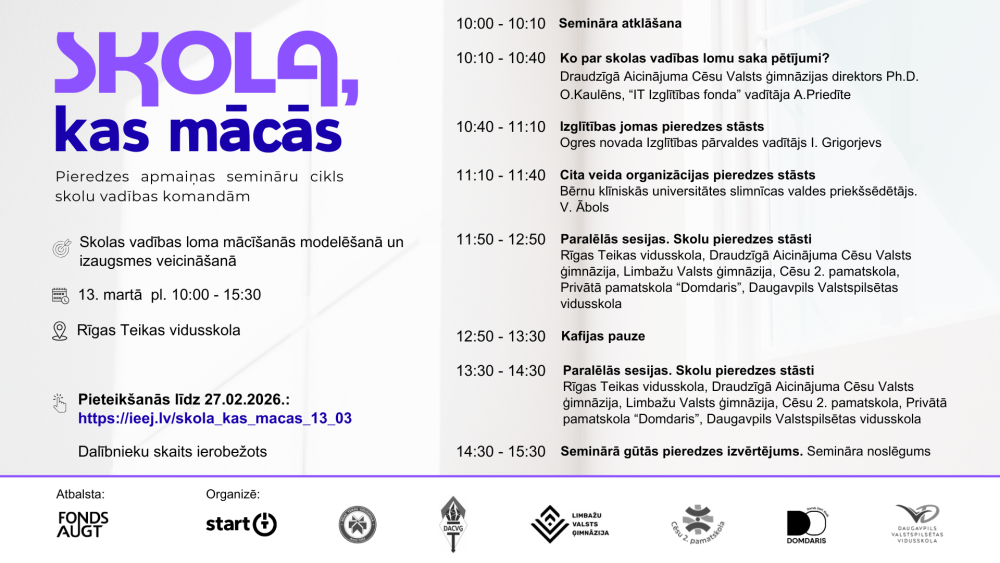 Aicinām skolu vadības komandas piedalīties 4. pieredzes apmaiņas seminārā “Skola, kas mācās”, kas notiks 2026. gada 13. martā no plkst. 10:00 līdz 15:30 Rīgas Teikas vidusskolā.